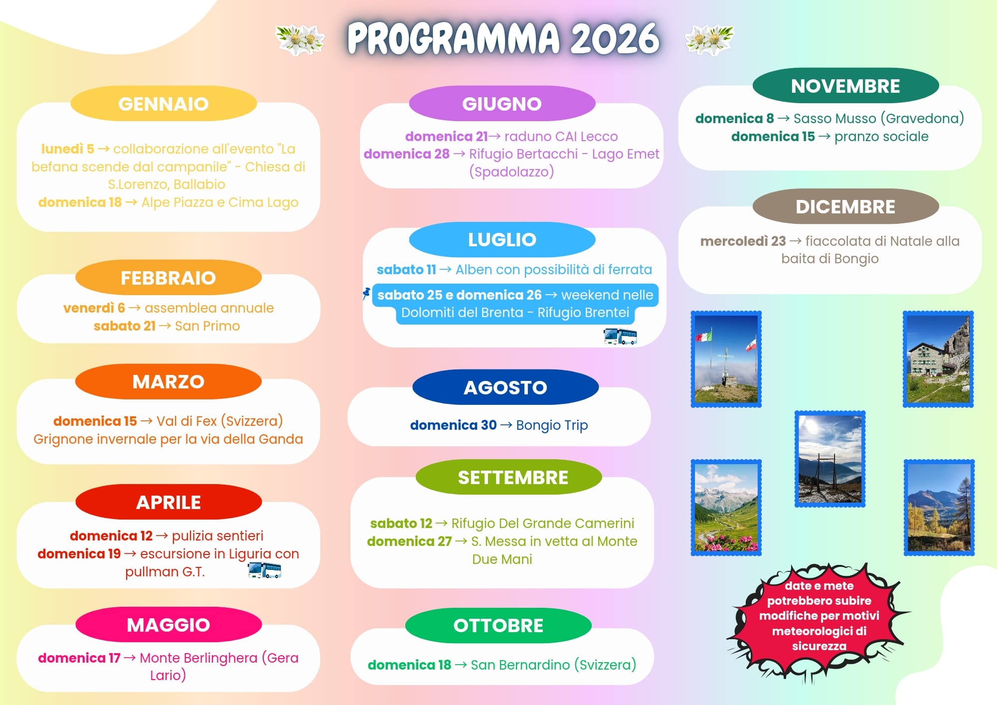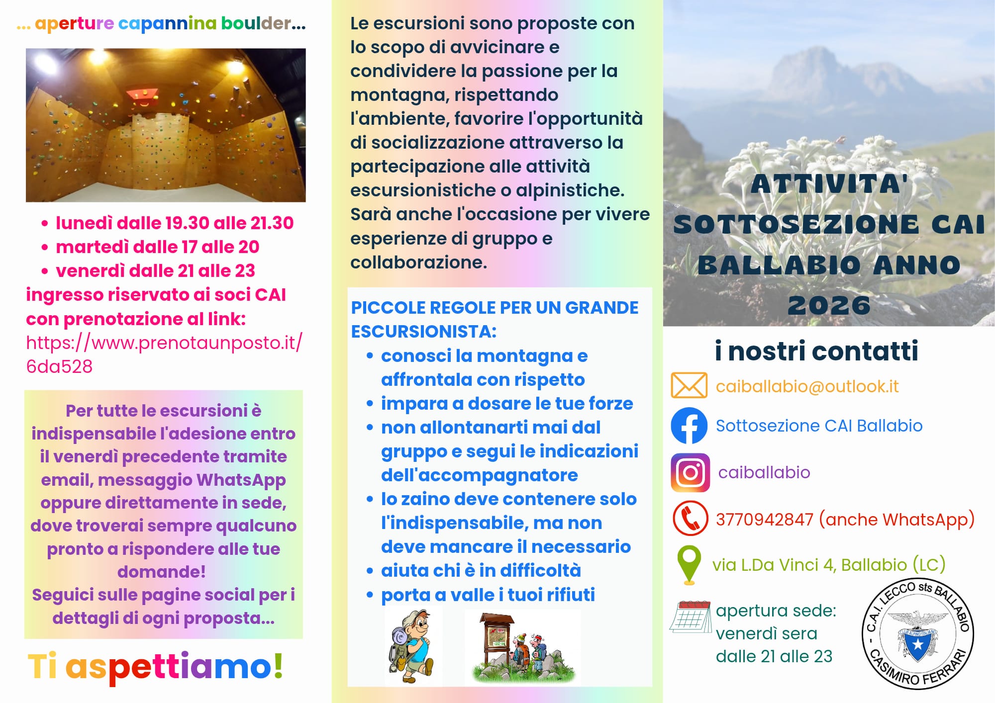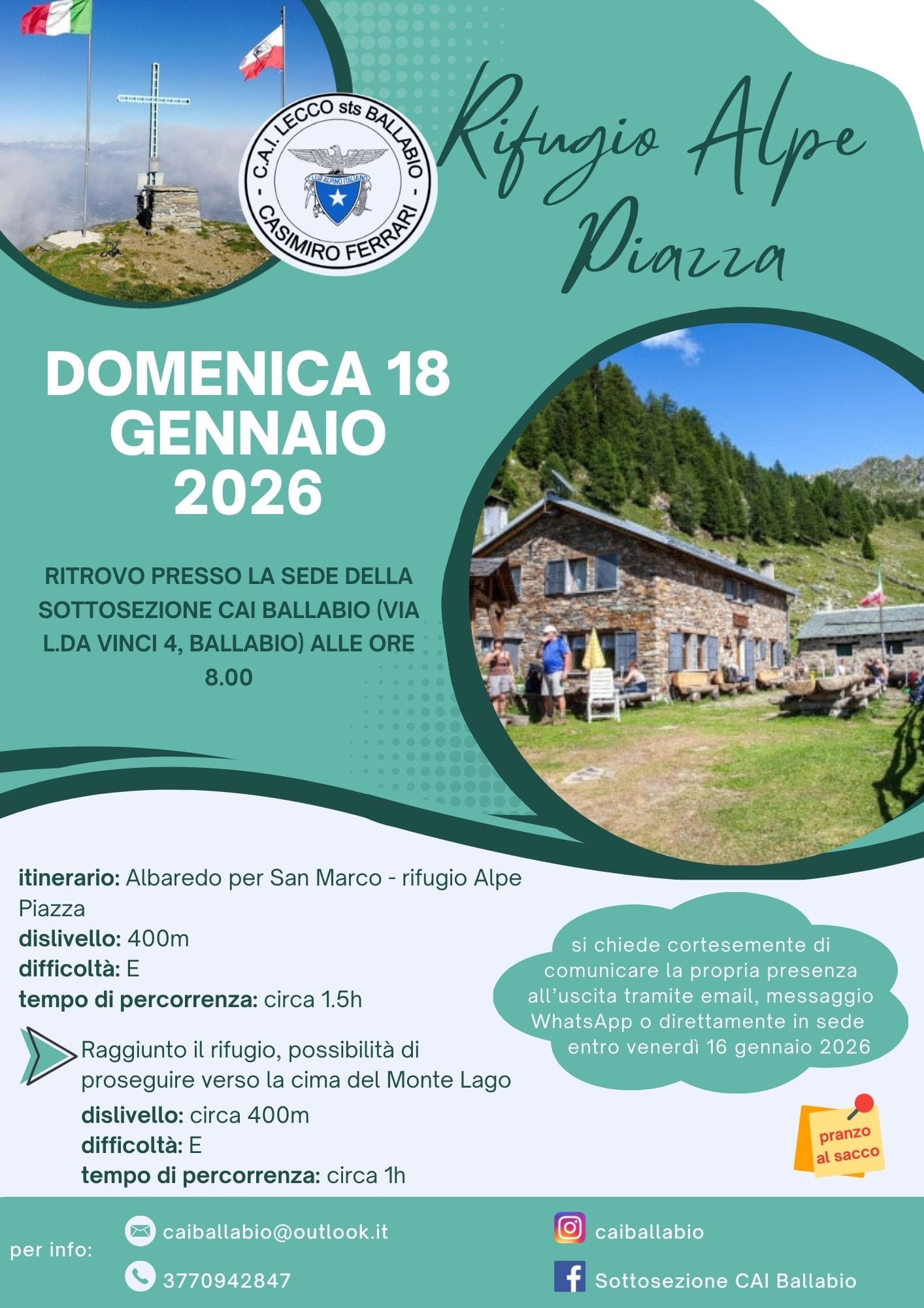 Programma 2026 Programma 2026 pieghevole DOMENICA 18.01RIFUGIO ALPE PIAZZA PROGRAMMA:Ritrovo ore 08.00 presso la sede della sottosezione CAI BALLABIO L’itinerario prevede: Albaredo San Marco – rifugio Alpe PiazzaDislivello: circa 400mDifficoltà: ETempo di percorrenza: circa 1.5hRaggiunto il rifugio è possibile raggiungere la cima del Monte Lago:Dislivello: circa 400mDifficoltà: ETempo di percorrenza: circa 1hComunicare la presenza entro venerdi 16 gennaio tramite messaggio whatsapp, via mail o direttamente in sede. Scarica la locandina ASSEMBLEA ANNUALE SOCI06.02.2026 Il consiglio direttivo CAI sottosezione Ballabio ti invita alla assemblea annuale soci presso la nostra sede CAI il 06.02.2026 come da convocazione allegata.Ti aspettiamo! Scarica la convocazione